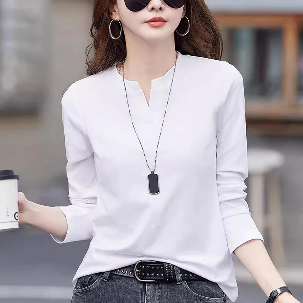 تي شيرت بأكمام طويلة من القطن الخالص باللون الأحمر الخمري للنساء في الربيع والخريف، قميص كاجوال جديد عصري مقاس كبير ورقبة على شكل حرف V
